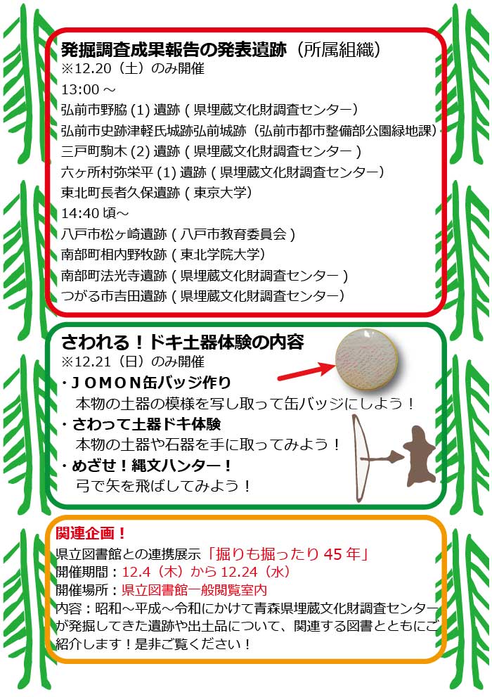 20日 12:00~17:00(最終入場 16:30)発掘調査成果報告 21日 9:30~16:00(最終入場 15:30)さわれる!ドキ土器体験 20日・21日 写真パネルと出土品の展示 |